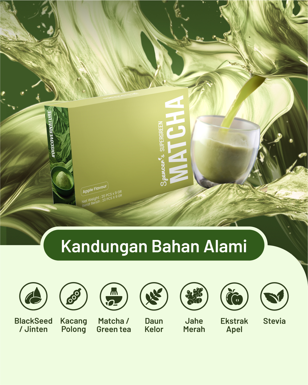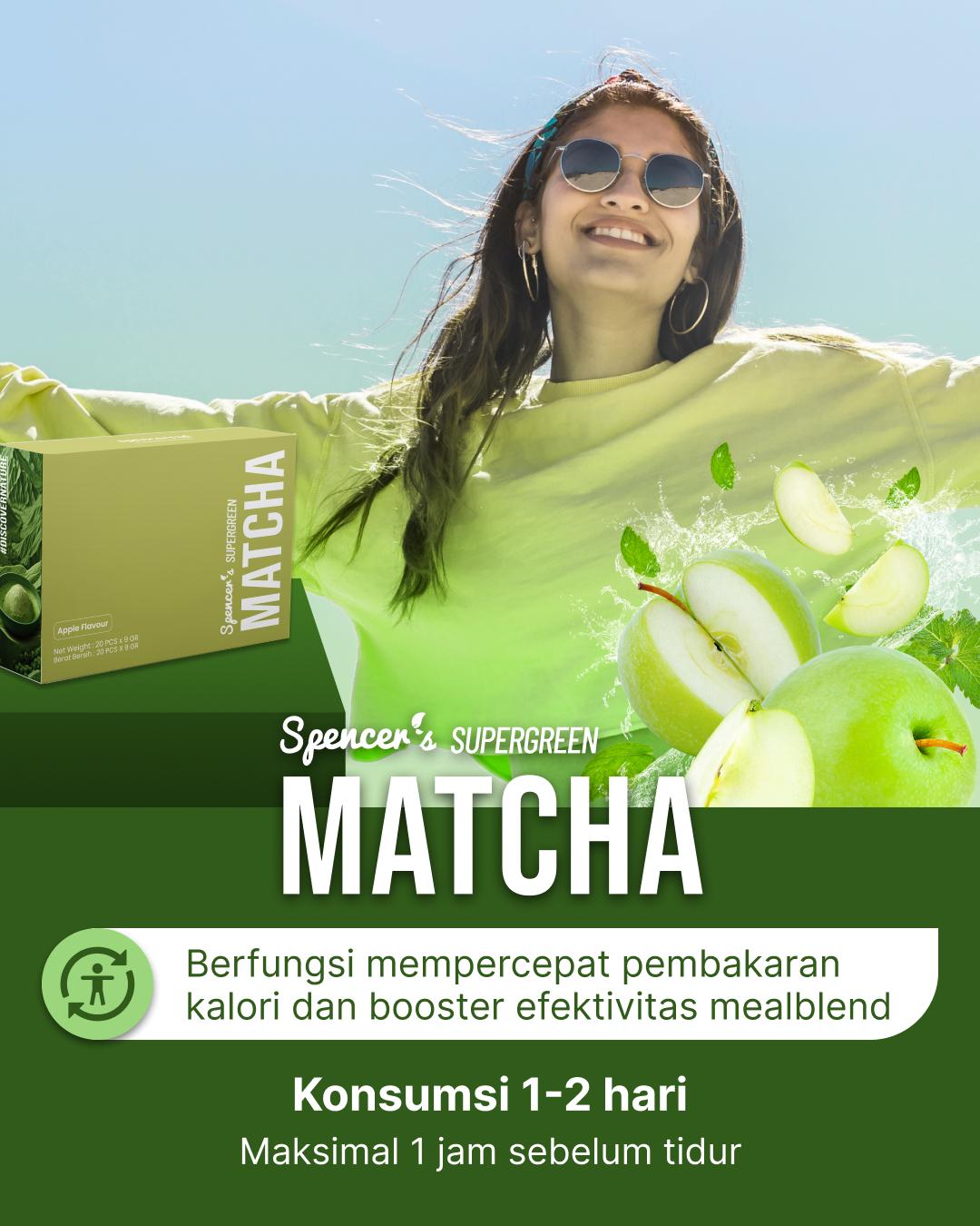 Supergreen Matcha Apple, MealBlend Booster, Bantu Bakar Kalori. Solusi menyenangkan untuk Langsing secara alami, cukup konsumsi Spencer's MealBlend sebagai pengganti 1x makan kamu plus Supergreen Mathca Apple sebagai Booster MealBlend bantu bakar kalori!